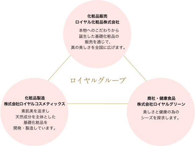 ロイヤルグループは身体の内と外、そして心の美しさをテーマに、美しい素肌を求める女性のための化粧品の製造・販売、そして健やかな暮らしをサポートするための健康事業を通じて、本物の豊かさを追求しています。